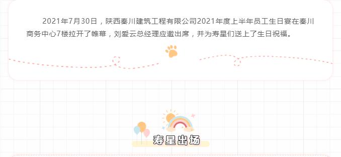 2021年7月30日,陜西秦川建筑工程有限公司2021年度上半年員工生日宴在秦川商務(wù)中心7樓拉開了帷幕。